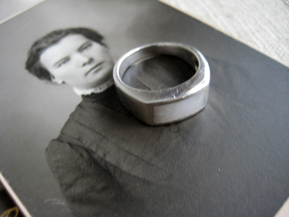 I only wear silver, never gold. I've always loved mother-of-pearl; now it reminds me of my mother and her mother (who says "pärlemor" in Swedish) and all the women in my family line (like Saima, of whom I often write about). Already as a child I played with mother-of-pearl buttons and buckles that had been passed through at least a couple of generations, and I still play with the same things, and I gather a collection around them so that when I'm gone there will be something beautiful left behind. I like how seeing the ring makes me think of happy thoughts. One edge of the mother-of-pearl inlay has a pattern like tears; this is me, happy and crying. And this is me and my family. And this is me, whom I cannot leave.