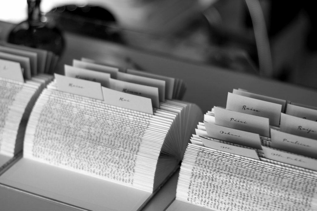 The escort card / drink ticket holders were folded in possibly the simplest manner possible: I drew a groove straight across the head of the book block (a little less than half-way from the front edge) using a sharp knife and used the mark it left as the starting point for folding individual pages. Having that mark there makes for a much more even end result than folding the front edge of a page to the spine fold. Matching the top edge to itself while folding is enough; the fold automatically forms at a right angle. For a purpose like this you want your book to have something like 250+ pages (obviously depending on the thickness of the paper used for pages, you'll want to skip Bibles and other books with über thin pages altogether) or it won't form a nice semicircle once laid open on a table. I've seen folded books like these used as holders for Christmas cards and as jewelry displays (rings and brooches, mostly, I think), but as always, your imagination is the limit.