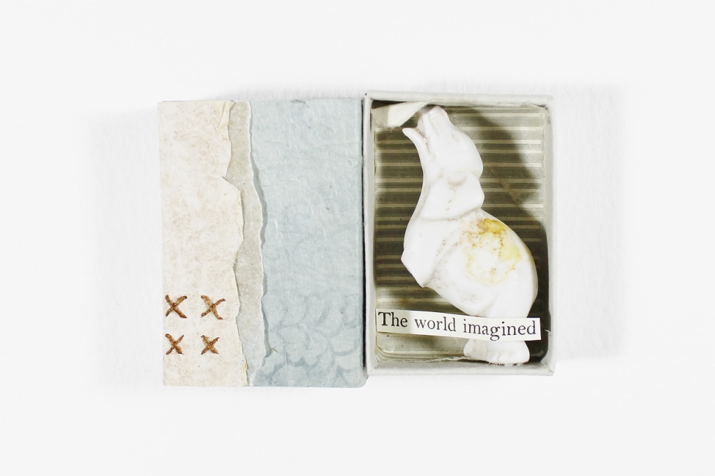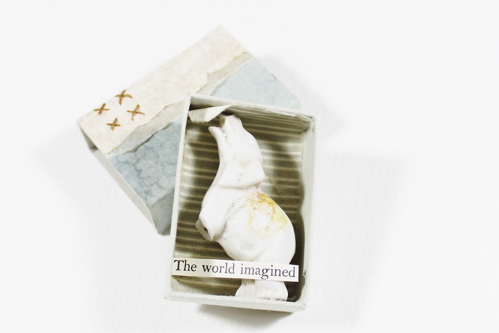 (vintage bisque elephant, cut up text, handmade and vintage papers, thread)