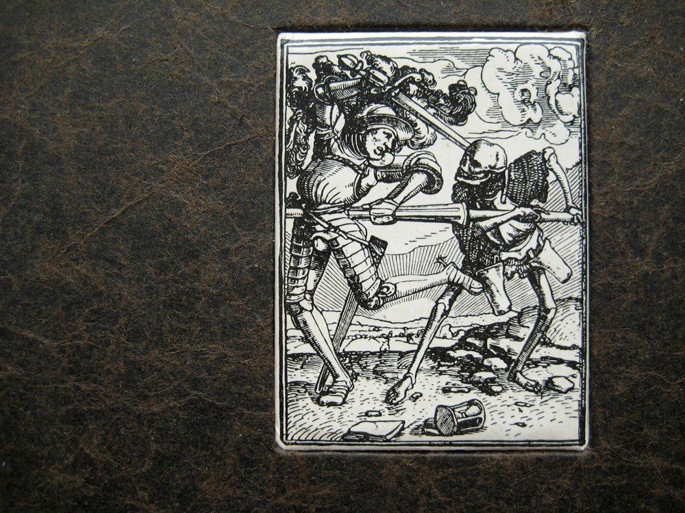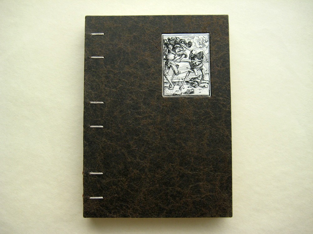 V's book. Coptic binding with tarred paper covers and a reindeer skin reinforced spine. V found the illustration from my old encyclopaedia, it's from Hans Holbein's Danse Macabre. (5.9"x8.3"/15x21cm. 160 pages.)