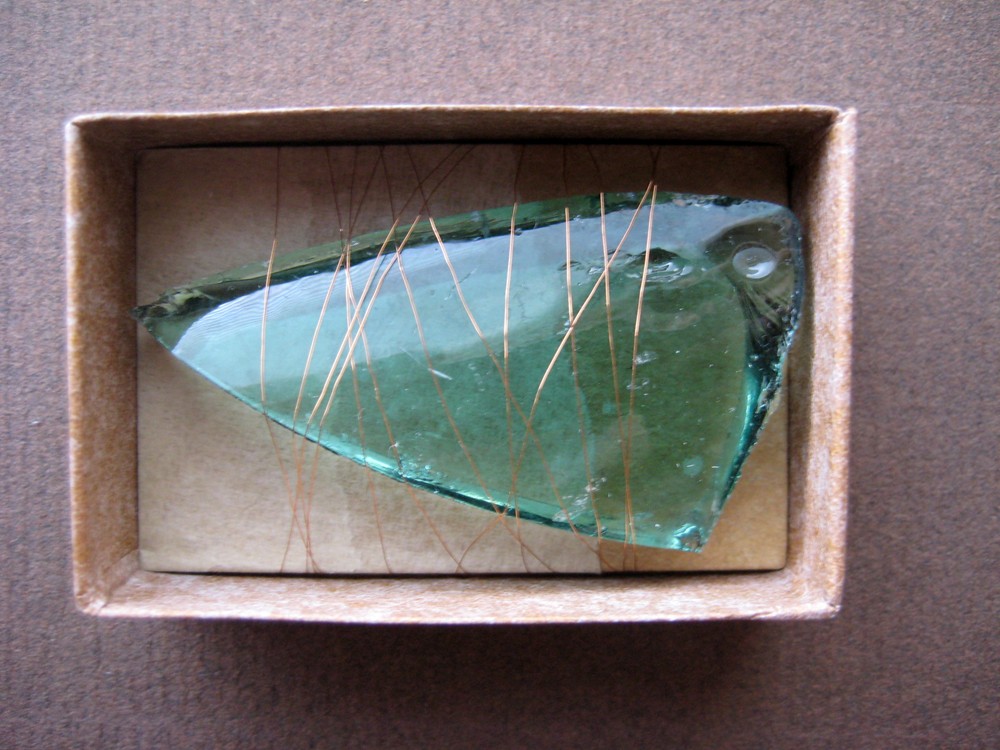 (vintage novel page, tissue paper, glass, copper wire)