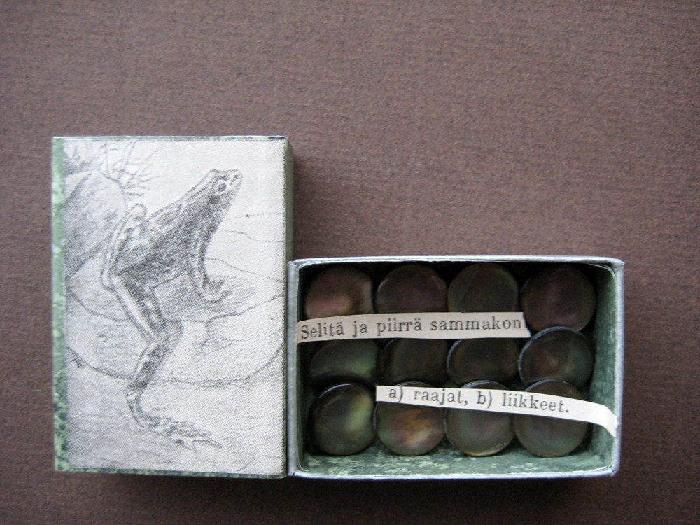 12 December 12, 2010 (vintage school book illustration and text, hand dyed paper, mother-of-pearl buttons) Explain and draw frog's a) limbs, b) movements. I would be clueless.