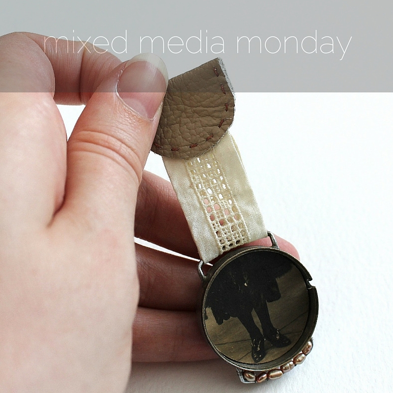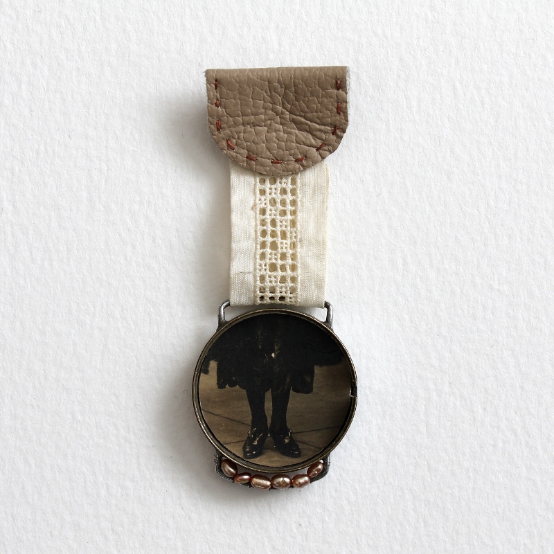 (vintage wrist watch case, vintage photo, vintage lace, recycled leather, freshwater pearls, brooch pin, thread, glue)