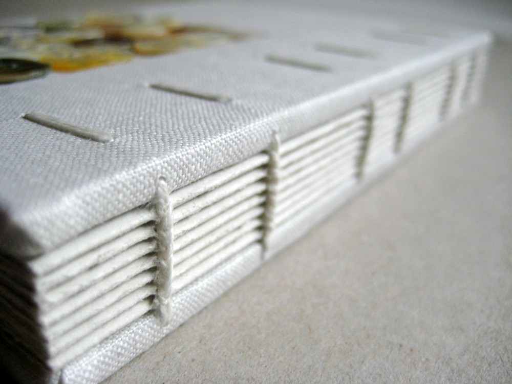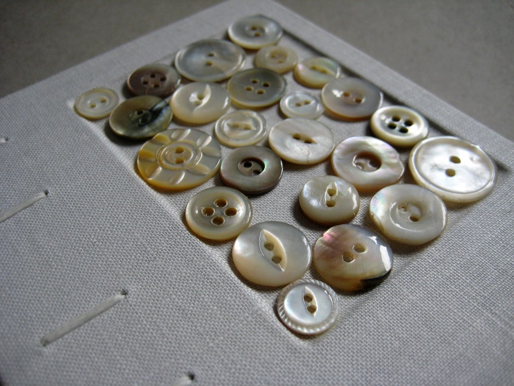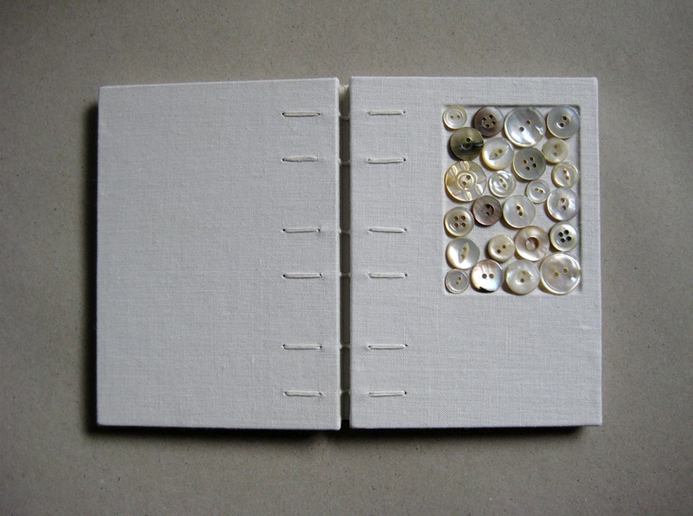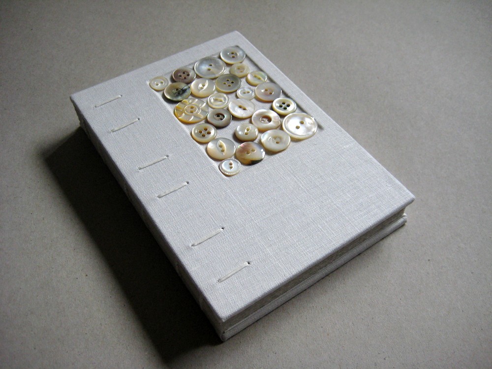 Buttons for my great grandmother and the most beautiful vintage linen I've ever had the pleasure to use in my books. This book is a postcard-sized coptic bound notebook with 84 pearl gray pages.