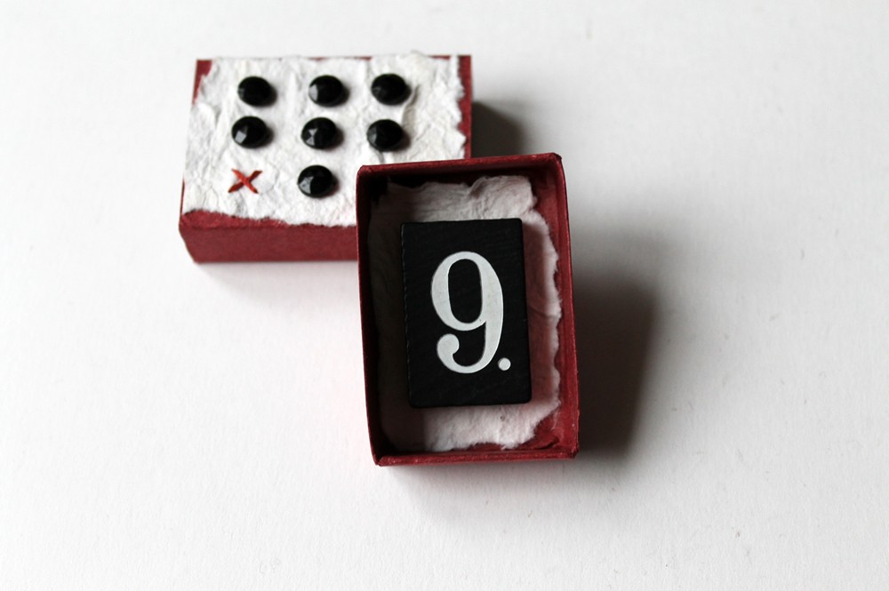 nine December 9, 2012 (vintage glass nailheads, vintage game piece, self made paper, tissue paper, thread)