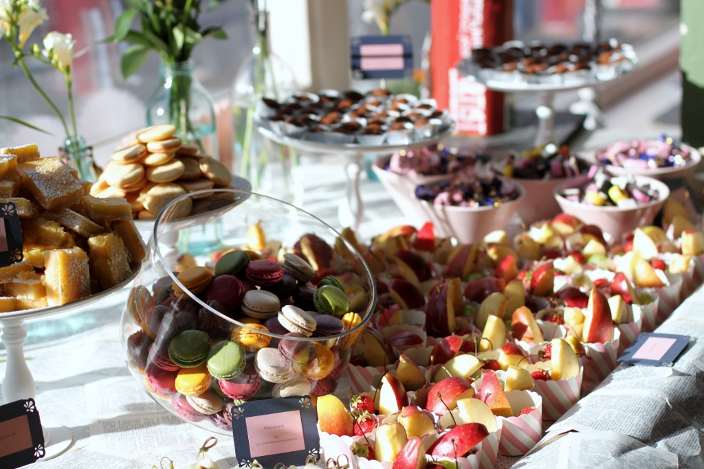 The buffet paper tablecloth (it's barely visible in the above photo) is made the same way I made my photo backdrop: vintage book pages just randomly glued together. The pedestal dishes I built out of wooden candlesticks and coasters and Ikea plates (which were stuck on at the last minute with double sided tape to make transportation easy).