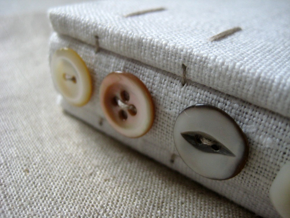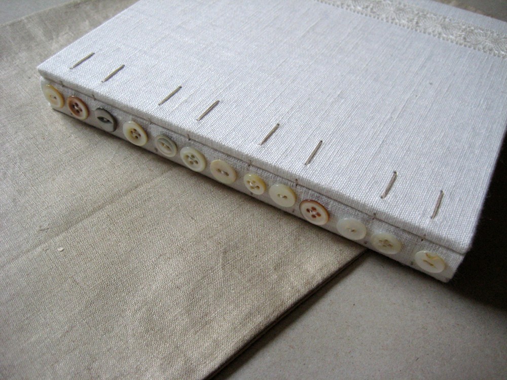 This book+bag combo was custom made for a lovely customer. The book is 7"x8" with pages of recycled gray paper. The binding is a coptic one with linen covered spine. I'm quite sure I will be making more books with buttons on their spines as this one really pleases me visually.
